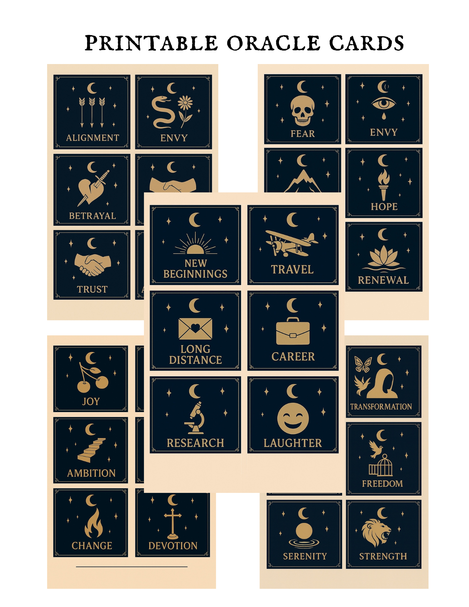 Unlock your intuition with this beautifully designed printable oracle card set! Featuring 36 unique cards with both positive and shadow keywords, this instant download is perfect for spiritual seekers, tarot lovers, and journaling enthusiasts. Each card is elegantly adorned with celestial symbolism—moons, stars, and minimal mystic illustrations—designed to inspire clarity, reflection, and growth. Includes matching instruction sheet, card backs for double-sided printing, and a bonus printable pattern. Ideal for rituals, self-reflection, daily pulls, or adding magic to your witchy grimoire.